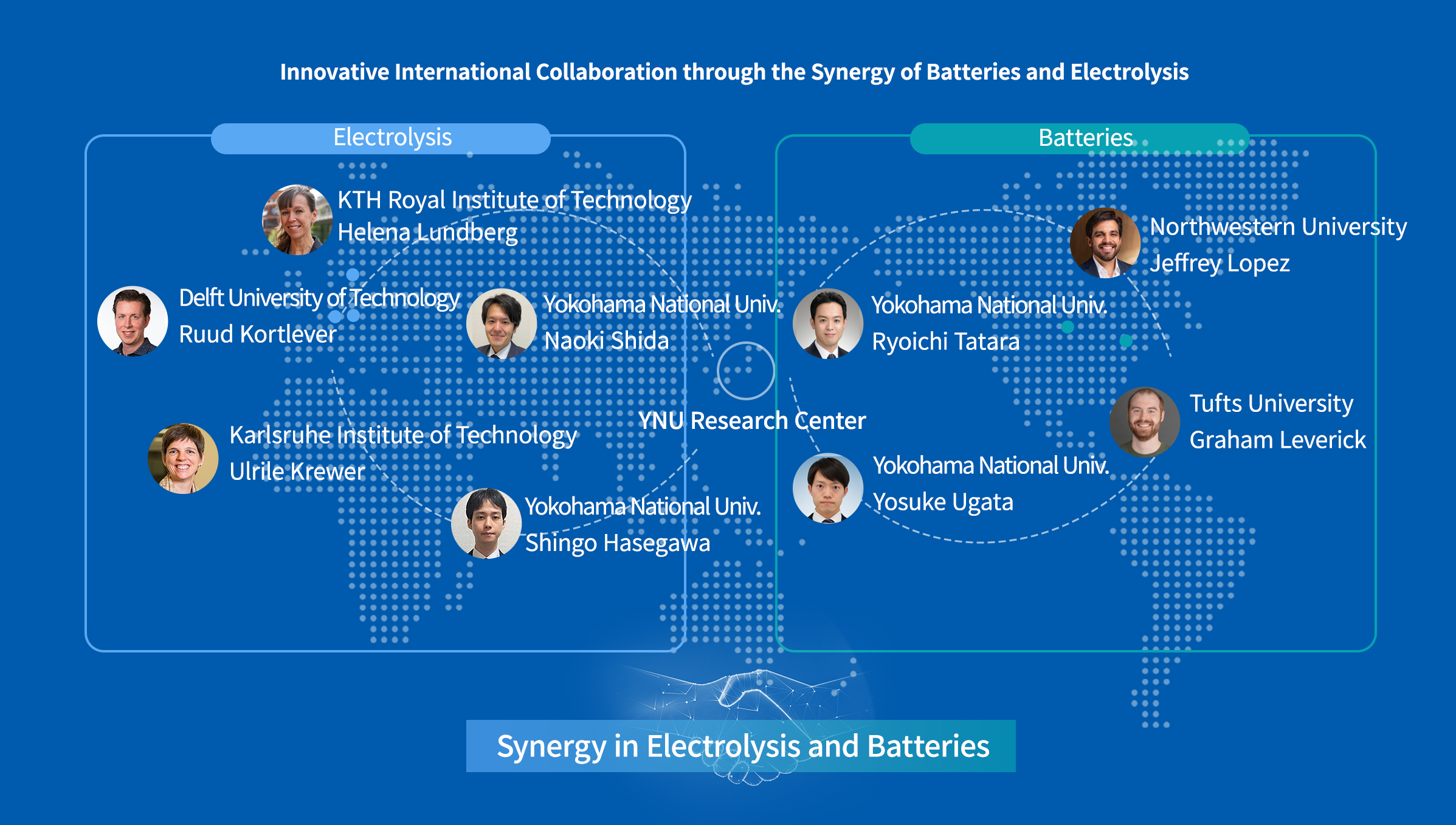 Our center is built around the JST ASPIRE for Rising Scientists program, “Establishing a Global Research Hub for Synergistic Battery-Electrolysis Technologies.” Through international collaborative research between early-career researchers at Yokohama National University and researchers from around the world, the center aims to advance both battery and electrolysis technologies and promote synergy between these two fields.